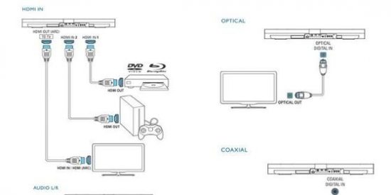 Lo mejor es usar cables HDMI para disfrutar de una mejor calidad de audio. Algunas barras de sonido usan cables ópticos pero estos cables están limitados a: estéreo, Dolby Digital 5.1 y DTX.