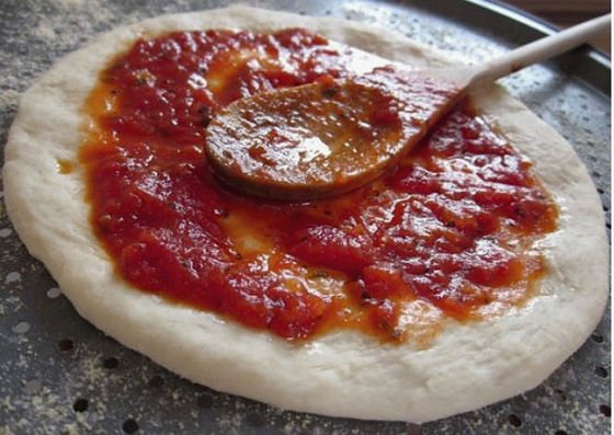 - Saca la base de pizza del horno, añade el tomate por todo el diámetro de la pizza.