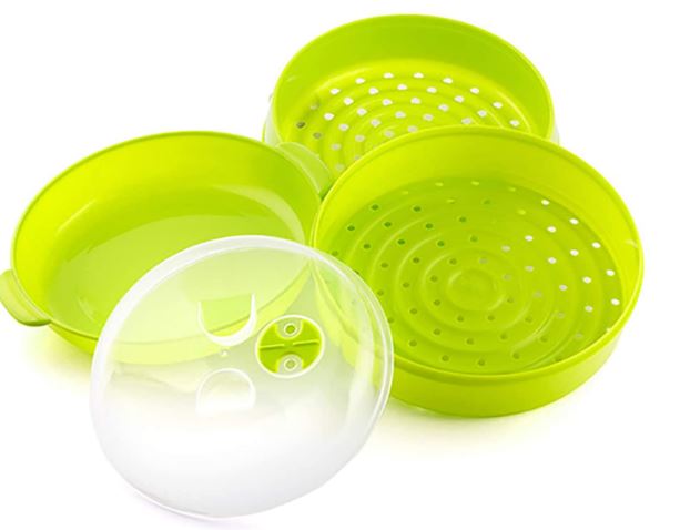- Lo ideal para esta receta es tener una vaporera de plástico para microondas, que la puedes encontrar desde unos 8 euros. Se trata de un recipiente de plástico que tiene una rejilla donde se coloca el alimento y bajo la rejilla se añade el agua, sin que el agua toque nunca el alimento.