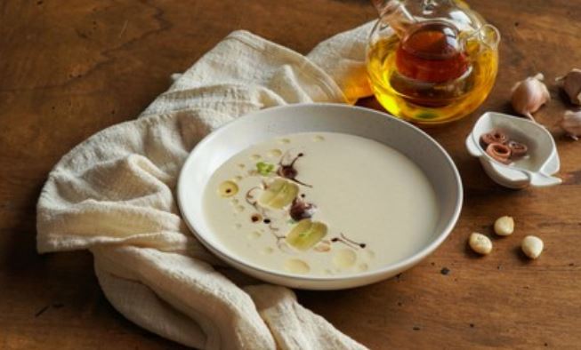 Receta refrescante y con fundamento, ajoblanco cordobés, dieta Mediterránea a cucharadas. Existen variantes del ajoblanco, como el malagueño o almeriense. Todos tienen en común ingredientes como el ajo, las almendras, el pan duro y el aceite de oliva virgen.