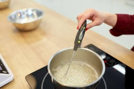- Para comprobar que tenemos el almíbar en su punto toma un poco con una cuchara (con cuidado que quema) ponle un poquito el en dedo pulgar y presiona con el índice, se debe formar una hebra. Apagar el fuego y dejar reposar.