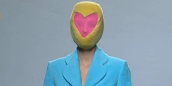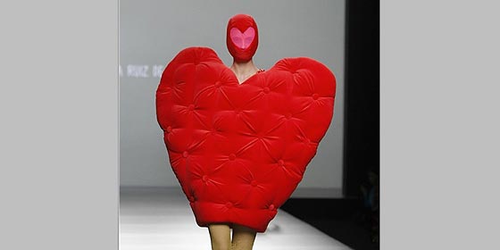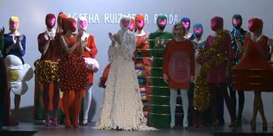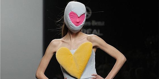 - Katy Mikhailova: Ágatha Ruiz de la Prada, temporada tras temporada, sigue soñando en su eterno mundo de la infancia, de los colores, de las formas y el del optimismo. Destacaría la falda acolchonada de terciopelo a modo de cojín. Sin embargo, no me gustó que no se les vieran las caras a las modelos con esas máscaras como si fueran medias en colores pastel con corazones.