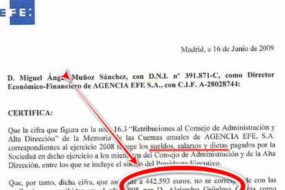 Entre los documentos y conviene reseñarlo, aparecía uno con el Número 6, elaborado por Miguel Angel Muñoz, director financiero de la Agencia EFE, en el que se puntualiza que la cifra de 442.593 euros no se corresponde con las retribuciones percibidas por Grijelmo como presidente ejecutivo, sino que “incluye otros conceptos”. Muñoz aclara que esos conceptos son “sueldos, salarios y dietas”. ¡Virgen Santa!