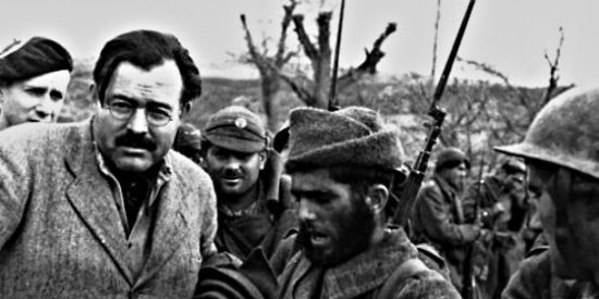 Hemingway con milicianos rojos, en el frente, durante la Guerra Civil española.