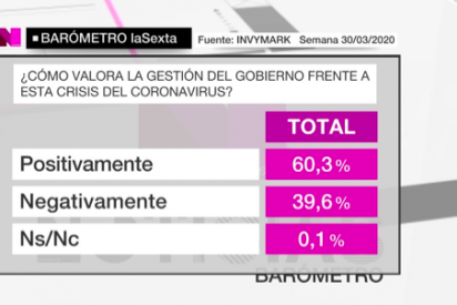 Dicen en laSexta, en su ‘Barómetro’, que “el 60% de los españoles valora positivamente la gestión del Gobierno frente a la crisis del coronavirus”.