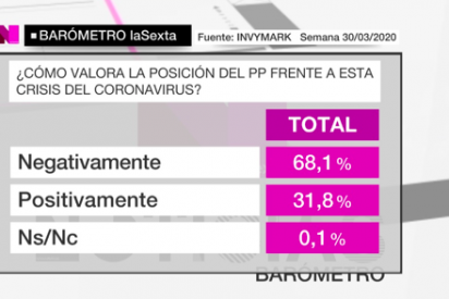 “la posición del PP ante el contexto del Covid-19 se mueve en otras cifras. Un 68,1% de los españoles encuestados valora negativamente la posición de los populares frente a esta crisis. No obstante, un 31,8% se muestra a favor del Partido Popular”.