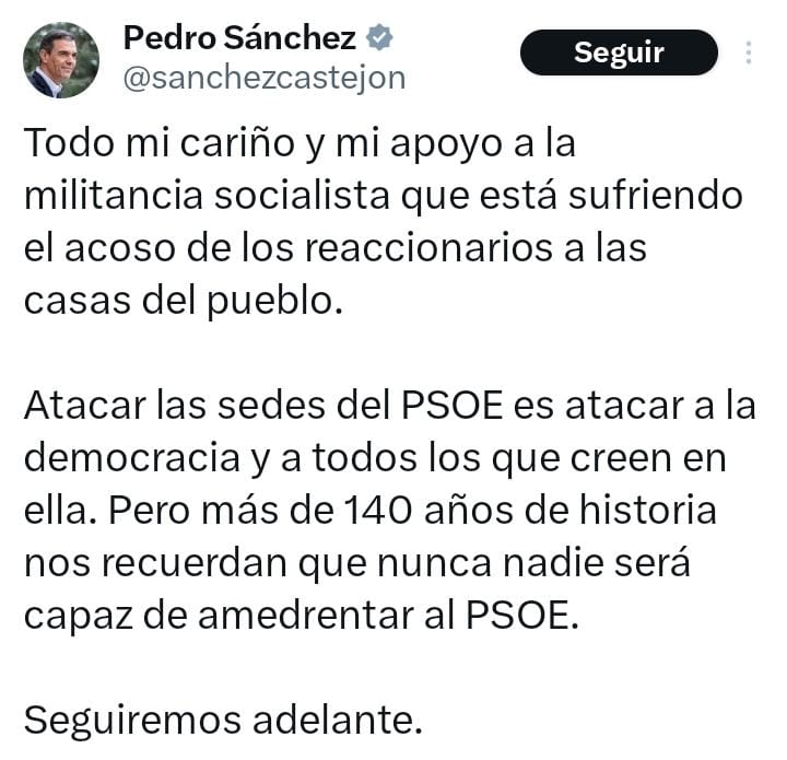 El mensaje subido a X por el socialista Sánchez, colega de Junts, Bildu, ERC y otros facinerosos, es para enmarcar de puro ridículo: