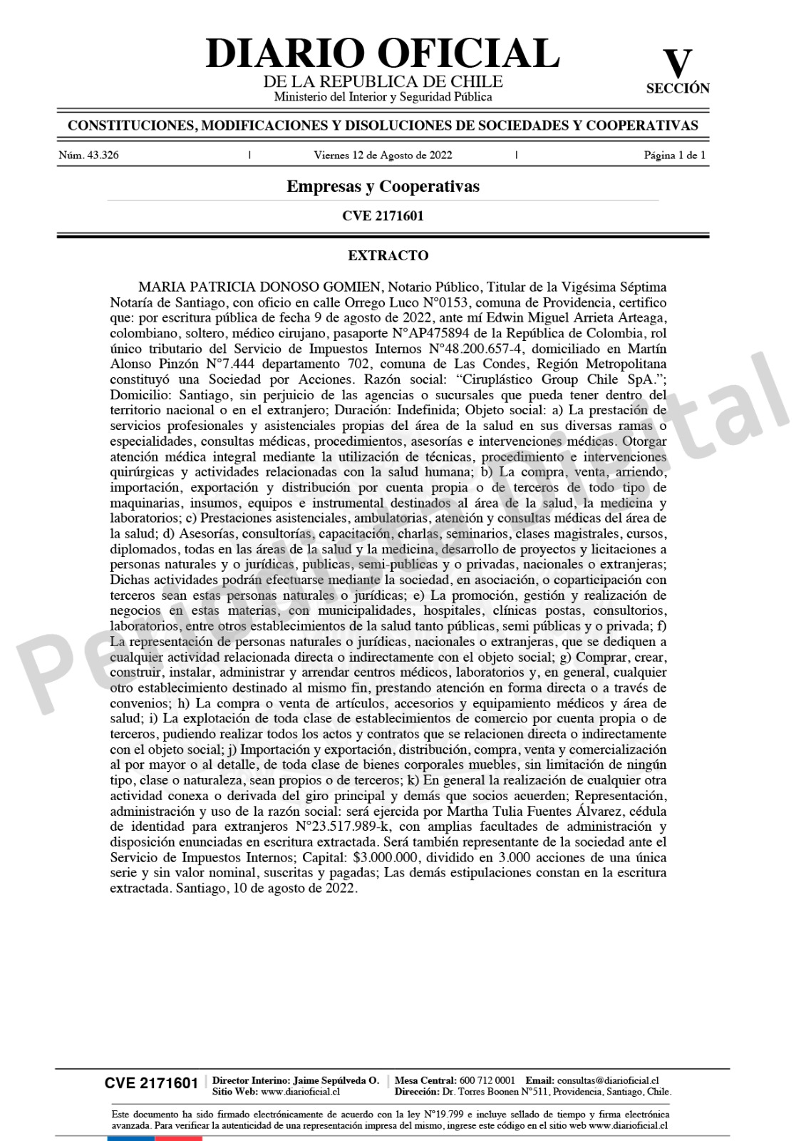 Daniel Sancho empezó a recibir las transferencias procedentes de Chile, cinco meses después de que Edwin Arrieta creara una sociedad inscrita en Diario Oficial de la República de Chile, el 12 de agosto de 2022, con 3 millones de pesos chilenos, “Ciruplástico Group Chile SpA.”. La sociedad, creada por Edwin Miguel Arrieta Arteaga abarcaba un amplio espectro de negocio ya que establecía la posible creación de otras agencias o sucursales dentro de Chile y/o en el extranjero. Su objeto social recogía desde la prestación de servicios profesionales y asistenciales dentro del área de la salud, actividades de compraventa y distribución de equipos e instrumental hasta la compra, construcción, administración y arrendamiento de centros médicos o laboratorios, entre otros. Un amplio paraguas legal que permite ver las actividades profesionales y empresariales planeadas por Edwin Arrieta. La constitución de la sociedad llevó consigo el nombramiento de un director interino, Jaime Sepúlveda.