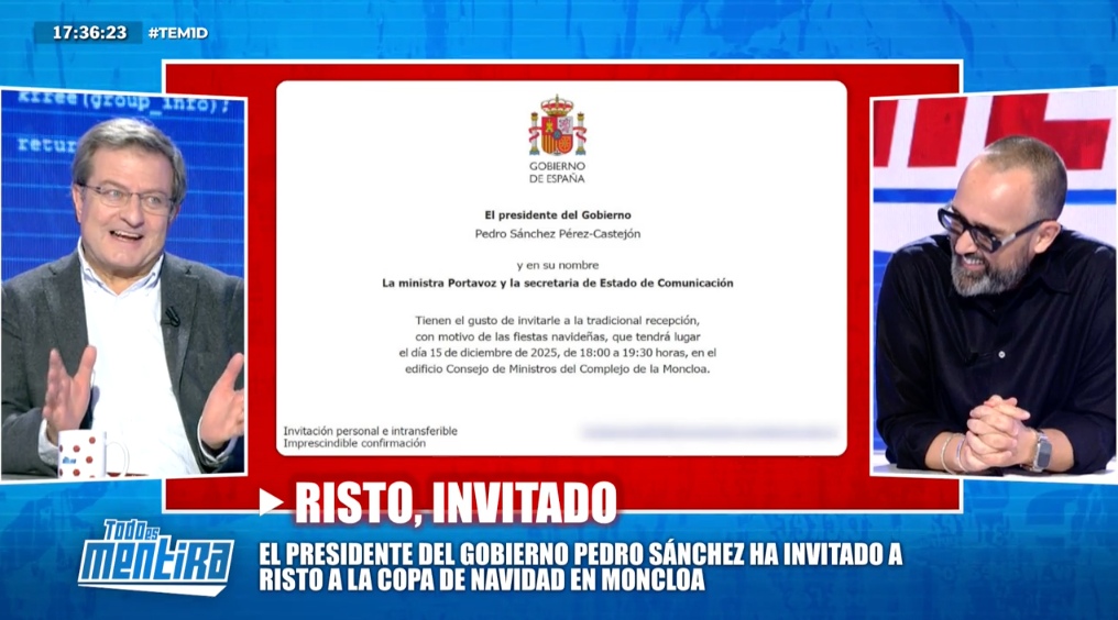 El mensaje llegó a través del correo electrónico oficial de comunicación de la presidencia del Gobierno. Risto Mejide leyó el contenido completo en directo: «El presidente del Gobierno Pedro Sánchez Pérez-Castejón y en su nombre la ministra Portavoz y la secretaria de Estado de Comunicación tienen el placer de invitarle a la tradicional recepción por las fiestas navideñas, que se celebrará el día 15 de diciembre de 2025, de 18:00 a 19:30 horas, en el edificio Consejo de Ministros del Complejo de la Moncloa«.