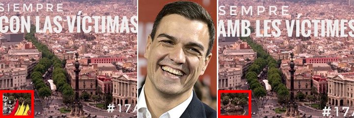 Un mensaje en español, para los españoles, y otro mensaje en catalán, para los catalanes, pero se ve que solo para los independentistas, y no para los que se sienten parte del conjunto de la nación. Pedro Sánchez, o su equipo de asesores o de comunicación, quitaron la bandera y el escudo de España con un truquito de Photoshop de la imagen que acompaña al texto en catalán, no sea que alguien se sintiera ofendido.