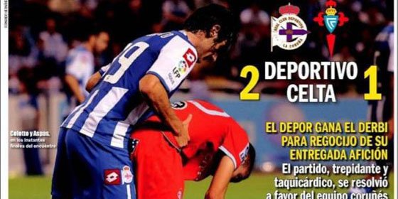 Fuera de los cuatro grandes diarios de este país, el periódico coruñés ‘Depor Sport’ publicó una de las portadas más polémicas del año titulando por ‘Orgásmico’ la victoria del Deportivo de la Coruña sobre su eterno rival el Celta de Vigo, a la vez que mostraba una foto de Colotto (Deportivo) con Aspas (Celta) en una posición interpretada por el diario como sodomizadora y que daba sentido al titular elegido.