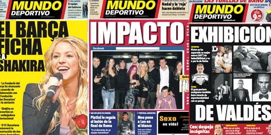 Atisbos de prensa rosa en Mundo Deportivo, y es que bajo la dirección de Santi Nolla el periódico soprendió a sus lectores con portadas ajenas al deporte. Aprovechando el boom mediático del romance entre Piqué y Shakira, el medio no dudó en dedicarle hasta dos portadas a la mexicana. El martes 1 de marzo de 2011 abría el periódico con una foto de la cantante acompañada para acompañar el titular ‘ El Barça ficha a Shakira’, en referencia a un acuerdo entre la fundación blaugrana y la de la artista. En esta misma línea, más llamativa sería la portada del jueves 27 de octubre de 2011 en la que aparecía bajo el título de ‘Exhibición’, un reportaje fotográfico de Víctor Valdés con su pareja, la modelo Yolanda Cardona, ambos escasos de ropa.