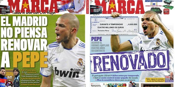 Eduardo Inda abandonó el barco ‘marquista’ el 19 de marzo de 2011 y Óscar Campillo recogió su testigo. Durante el año 2011 el diario Marca nos ha obsequiado con portadas polémicas y controvertidas, y también algunas de información de dudosa fiabilidad, como las publicadas el 9 de febrero (‘El Madrid no piensa renovar a Pepe’) y el 21 de marzo (‘Renovado’). Entre ambas hay poco más de un mes, en la primera se descarta la posible renovación del central del madridista Pepe, por sus exigencias económicas, y en la segunda se publica a toda página la firma del jugador, con un fotomontaje en el que se ve al futbolista agarrando un cheque.