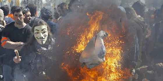 Portugal. «Diario de Noticias» elige también una fotografía tomada en Barcelona, donde se produjeron los mayores incidentes. Un manifestante, que sostiene un cartel («Contra la agresión de los ricos y sus políticos: ¡Autodefensa!»), permanece frente a un fuego en la calzada. El titular: «El día en que Barcelona se pareció a Atenas».