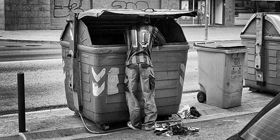 A continuación, en la galería fotográfica, aparece un joven de espaldas, rebuscando en un cubo de basura, con la cabeza dentro. Bajo la imagen se lee: