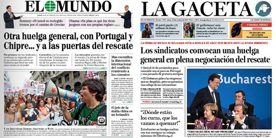 Las portadas de este 18 de octubre de 2012 vienen en clave económica local, pero también internacional. Por lo pronto, los sindicatos españoles se unen a una especie de gran cónclave europeo laboral para montar una huelga general en España para el 14 de noviembre, es decir, dentro de 27 días.