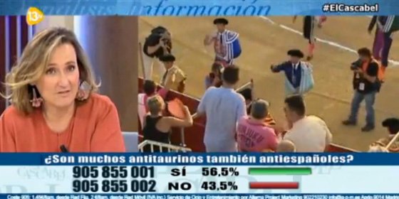 «Es muy importante aclarar este tema, porque hoy en otras tertulias he escuchado cómo algunos han cogido el todo y no la parte, y han dicho que la Señora Aguirre ha dicho que todos los antitaurinos son antiespañoles. ¡Oiga usted, no ha dicho eso! Se refiere a aquellos que prohiben las corridas de toros, porque en el fondo efectivamente los toros simbolizan nuestro ser español, y no a los antitaurinos que por otras razones están en contra de los toros […] Hoy en Cuatro, en laSexta, aquí y allá han dicho eso precisamente, ¡y eso es manipular!»