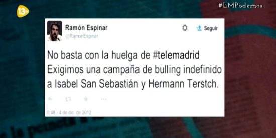 Ramón Espinar, diputado de Podemos en la Asamblea de Madrid, pedía «bulling» (sic) contra Isabel San Sebatián y Hermann Terstch públicamente en su cuenta personal de Twitter:
