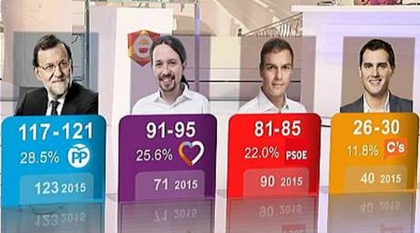 El sondeo auguraba 121 escaños para el PP (obtuvo 137), la segunda posición con Podemos con una horquilla máxima de 95 escaños (quedó tercero con 71) y la tercera posición para el PSOE con 85 escaños (obtuvo esos escaños pero quedó en segunda posición) Sólo se podría decir que acertó con Ciudadanos.–Iñigo Errejón reconoce que «estos resultados no son los que esperábamos» en Podemos–