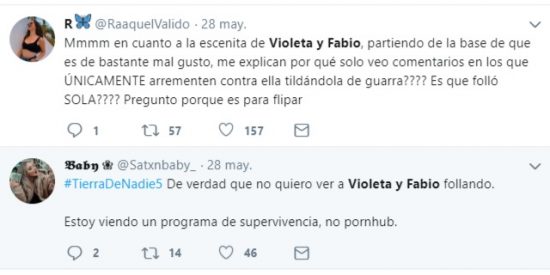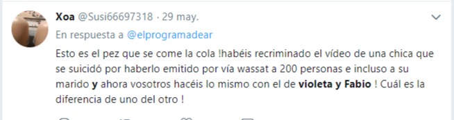 Y solo la juzgan a ella, Fabio como si no existiese. Twitter clama por ello. «Habéis recriminado el vídeo de una chica que se suicidó por haberlo enviado vía whatsapp a 200 personas e incluso a su marido y ahora vosotros hacéis lo mismo con el de Violeta y Fabio. ¿Cuál es la diferencia de uno y otro?», pregunta una tuitera. Y así un largo hilo de comentarios y críticas.