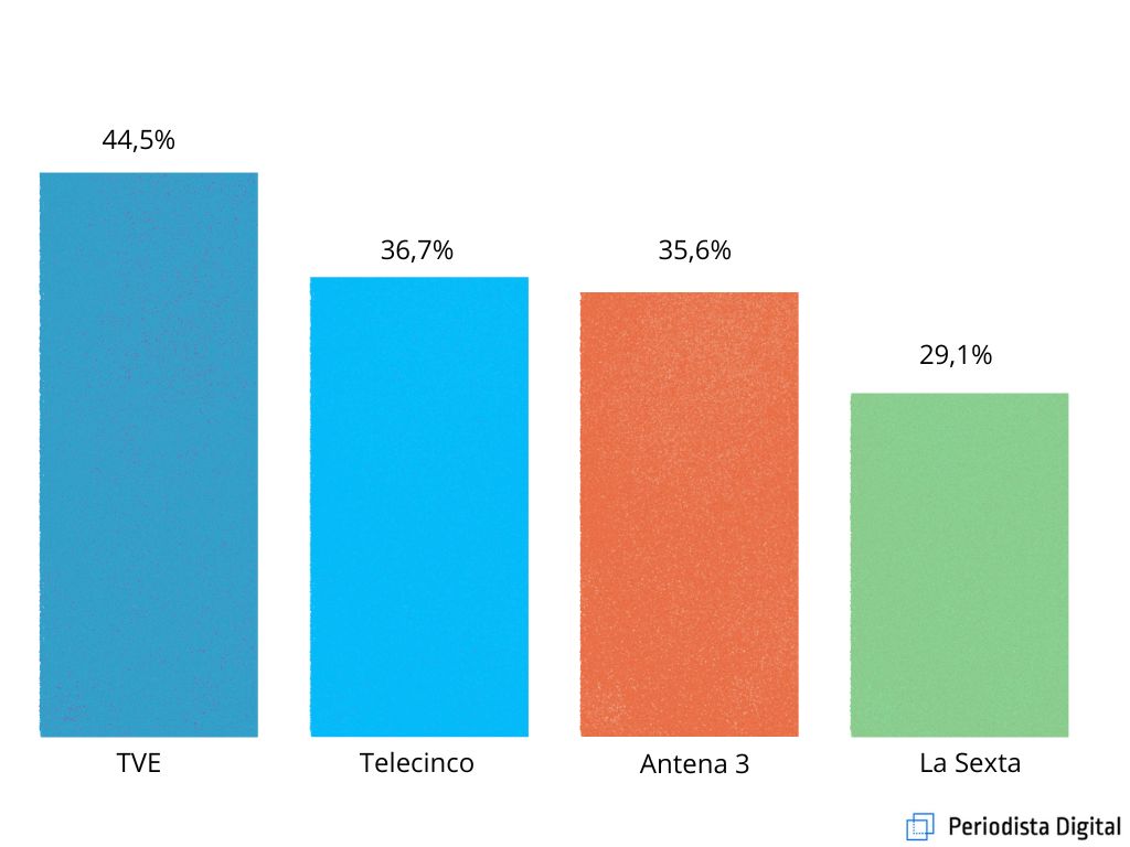En los cuatro canales informativos principales: TVE, Telecinco, Antena 3 y laSexta, Pedro Sánchez es el político que lidera todos los informativos, obteniendo el mayor porcentaje, con respecto a los demás entes públicos. En La 1, Sánchez, obtiene un total de 44,5%. En Telecinco un 36,7%, en Antena 3, se posiciona con un 35,6%, y, por último, La Sexta, con un 29,1%.