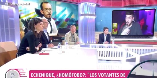 Ya, por ejemplo, es que Echenique al final no puede practicar ni sexo anal ni vaginal, entonces que normal que sienta esa frustración. Entonces lo está canalizando de una forma, yo creo, incorrecta. Al final pues ha tenido que borrar los tuits, básicamente, porque se le ha echado la izquierda encima. Ahora, no he visto a ninguno de Podemos condenarlo, por cierto. He visto a gente del PSOE, he visto a gente de izquierda, pero no he visto a ningún dirigente de Podemos condenar este tuit asquerosamente homófobo.
