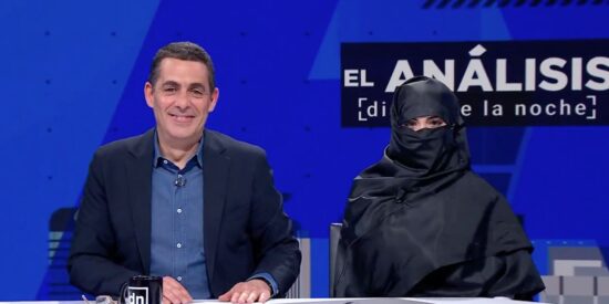 Vamos a ver, señoras y señores, según todos los partidos de España que dicen ser progresistas y otros que se asocian con ellos, como el de Puigdemont, esta imagen que ustedes están viendo aquí, a mi lado, ¿verdad? no debe ser prohibida en ningún espacio público. Bueno, ella es Ana, una estupenda periodista, pero no la pueden ver porque hoy, durante un ratito, nos está ayudando a entender cómo se puede sentir una mujer obligada por su marido a ir tapada con un niqab o con un burka.