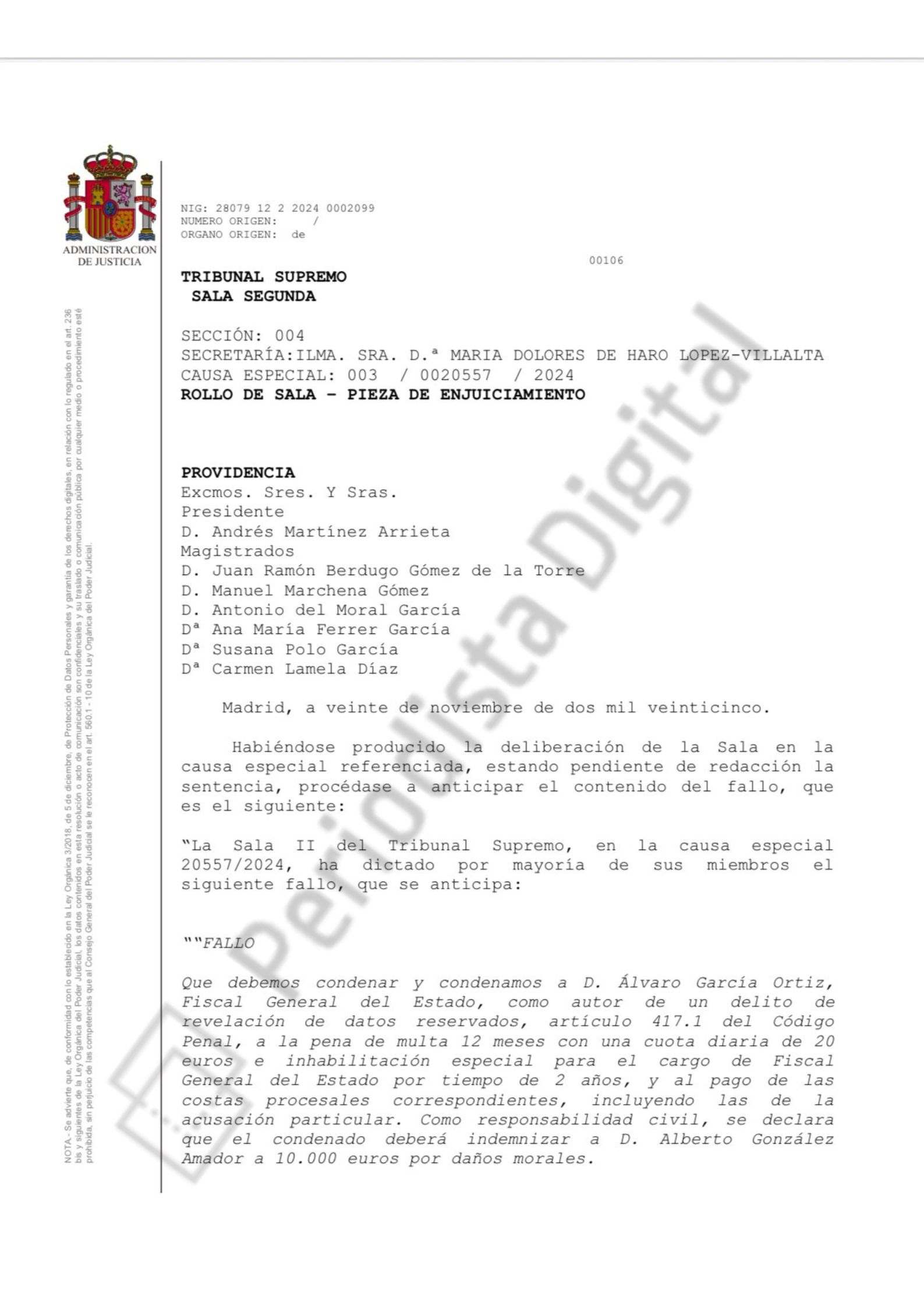 El Tribunal Supremo (TS) ha condenado al fiscal general del Estado, Álvaro García Ortíz, por revelación de secretos a dos años de inhabilitación. Además, deberá pagar una multa de 7.200 euros, las costas y una indemnización de 10.000 euros a la pareja de Isabel Díaz Ayuso, afectado por las acciones del jefe del Ministerio Público.