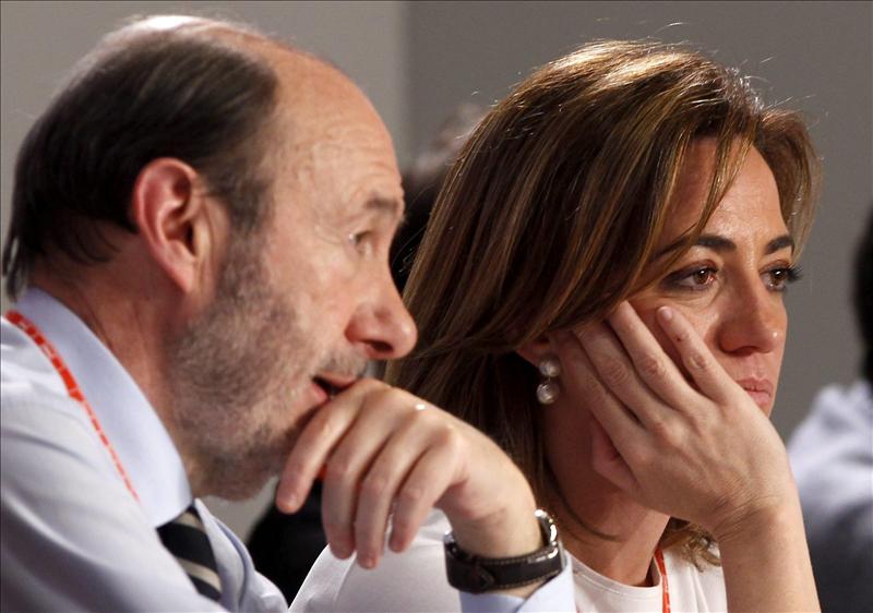 Y aparecieron al rececho. Los dos solos: Él, Alfredo Pérez Rubalcaba, a la derecha, flaco, con los hombros caídos, el traje arrugado y con cara de cansado. Ella, Carme Chacón, a la izquierda, metida en un traje pantalón, con el rímel sin retocar y con un bolso en el hombro. Iban serios, hoscos, cansados y callados. Al cruzarse con el periodista, le hicieron un conato de intento de amago de gesto de saludo. Tan cansados iban. Después siguieron andando hasta el final del pasillo, abrieron una puerta alta y grande, muy alta y muy grande y los dos intentaron entrar dentro. Pero encontraron un problema: cuál de los dos debía entrar primero.