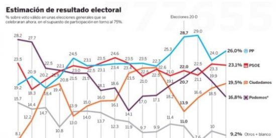 La encuesta le otorga una estimación de voto del 26%, dos puntos por encima de lo que el mismo sondeo le atribuía hace un mes, pero todavía casi tres puntos (2,7%) por debajo del resultado obtenido en las generales de diciembre.