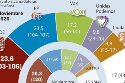 Según esta encuesta, realizada entre el 18 y el 20 de noviembre, el PP obtendría entre 104 y 107 diputados; VOX, entre 56 y 60 escaños, y Ciudadanos, entre 15 y 17 parlamentarios.