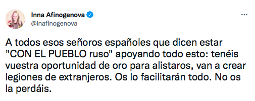 “A todos esos señoros españoles que dicen estar «CON EL PUEBLO ruso» apoyando todo esto: tenéis vuestra oportunidad de oro para alistaros, van a crear legiones de extranjeros. Os lo facilitarán todo. No os la perdáis”.