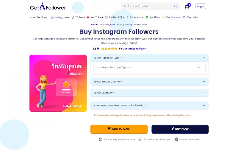En el otro extremo, pero aún dentro de opciones confiables, está GetAFollower. Este proveedor de servicios suele atraer a quienes buscan algo más económico o con mayor control sobre el pedido. Permite elegir entre seguidores globales o segmentados por país, lo que resulta útil para cuentas que trabajan con audiencias específicas.