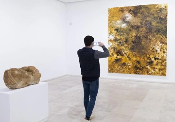 (Un visitante, ante una escultura de Baltasar Lobo y el lienzo ‘El dorado’, de Carlos León)