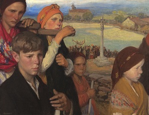(Fernando Álvarez de Sotomayor. Procesión en Sergude, h. 1936. Óleo sobre lienzo. 71 cm x 92 cm. Colección particular José Barros)