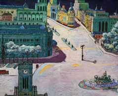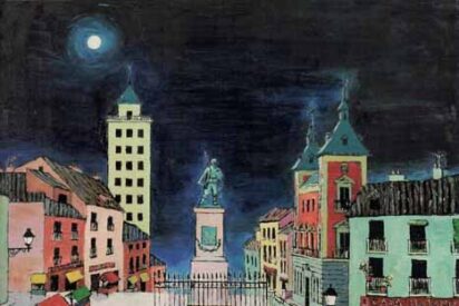 (Fernando Delapuente, La Cibeles en su plaza a la luz de la luna, 1970. Óleo sobre lienzo. Colección particular)
