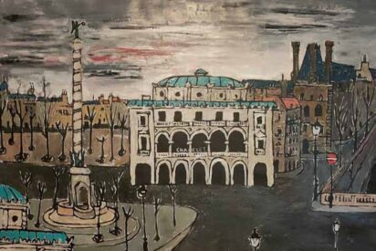 (Fernando Delapuente, Place du Châtelet en París, 1958. Óleo sobre lienzo. Colección particular)