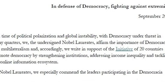 Estamos especialmente preocupados por los terribles efectos sobre la prensa libre, la libertad de expresión y la libertad académica que se ha producido en muchos países y por los terribles efectos de las demandas por difamación contra periodistas en el mundo, así como por el inmenso poder de amplificación de la desinformación cedido a las plataformas tecnológicas y ahora a las empresas de inteligencia artificial generativa”. Cuarenta y tres Premios Nobel presentaron una carta titulada “En defensa de la democracia, luchando contra el extremismo” durante la 80ª Asamblea General de las Naciones Unidas, en Nueva York. Entre los firmantes se ...